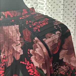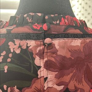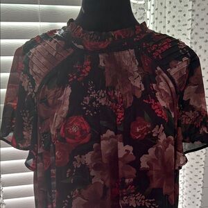 Chic blouse with vibrant floral pattern. Features ruffle neck and short sleeves. Ideal for stylish outings.