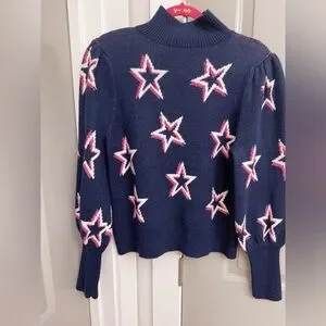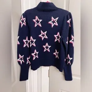 This GAP knit pullover sweater features a deep navy blue base with an allover bold star design outlined in white and pink. Designed with a cozy mock neckline and structured puff shoulders, it offers a statement-making yet comfortable option for cooler days.