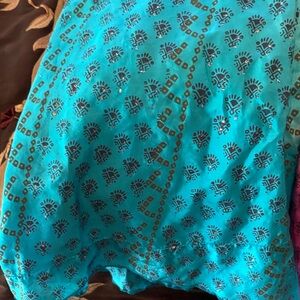 Vibrant A-line skirt with pink and blue hues. Features intricate patterns and a decorative waistband.