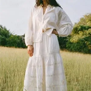 Inspired by a Victorian underskirt and crafted in crisp 100% Organic Cotton, the update to our beloved Gabrielle Skirt is here! With an elastic waistband, pintuck and trim details throughout, the Perla skirt is a beautifully intricate and delicate update to our assortment of bottoms. Pairing perfectly to our new Ghita Blouse, the Perla skirt is finished with a sweet satin functional tie detail at the tier that threads through the lace