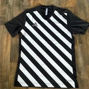 Stylish Adidas jersey with bold diagonal stripes. Ideal for sports or casual wear. Comfortable and trendy design.