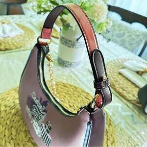 Stylish Nicole Lee shoulder bag with playful design. Features pink and blue tones. Accented with gold chain and pearl details.