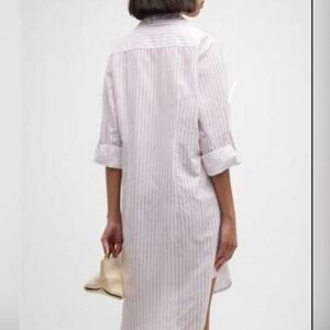 This elegant dress features a high low hem and a dress shirt collar, making it ideal for both casual and work occasions. The 3/4 cuffed sleeves add a touch of sophistication, while the pink and white stripes offer a subtle yet stylish flair. Its buttoned front and slit detail ensure comfort and ease of movement.