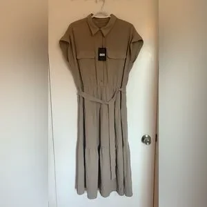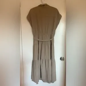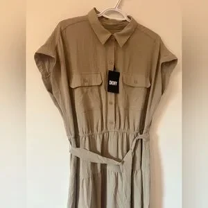 DKNY Khaki Tiered Button Down Tie Waist Midi Dress New with tags Size 12 US Retails for $134USD
