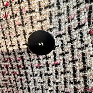 Elegant tweed blazer with a chic black, pink, and white weave. Features subtle red accents and classic double-breasted design. Ideal for both formal and casual occasions.