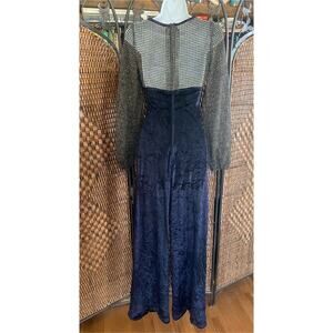 What a great piece for a holiday party. Wide leg velvet pant suit with open weave sparkle top and balloon sleeves. Top has chastity panel in front, is open sheer in the back. Elastic cuffs. Garments has lots of stretch and will fit a range, depending on desired fit. Zips up back.