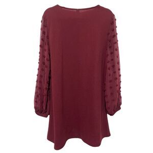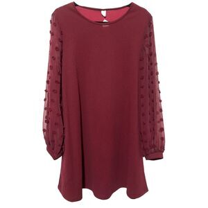New Elegant Swiss Dot Sheer Long Sleeve A-Line Burgundy Mini Dress Large