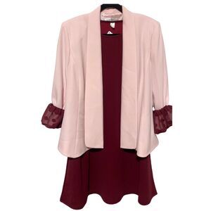 New with tags this semi-formal cocktail short dress features see-through contrast puff sleeves with 3D applique in a tunic silhouette. Trendy maroon wine red colorway make this party dress perfect for fall/winter. Wear yours to holiday parties or any occasion requiring tasteful black tie attire.