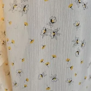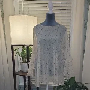 Chic cream blouse with delicate floral pattern. Features flowy sleeves and lightweight fabric.