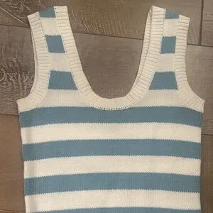 Chic knit top with bold blue and white stripes. Ideal for casual wear.