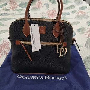 Elegant satchel with gold-tone accents. Features signature charm and dual handles. Ideal for stylish outings.