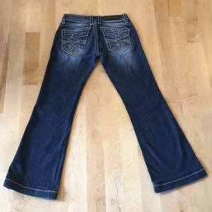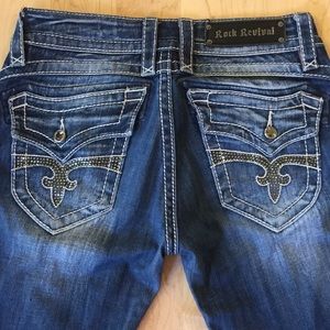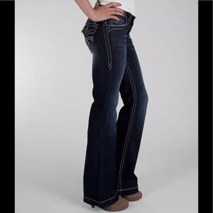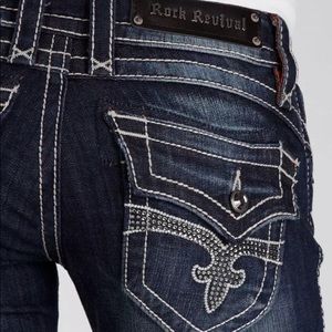 Rock Revival Scarlett Wide Leg Stretch Trouser jeans. Designed exclusively for Buckle. Back flap pockets. Sparkly rhinestone details.