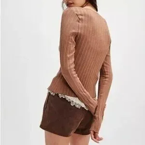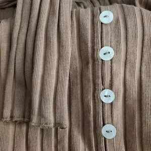 Stretchy ribbed knit fabrication, scoop-neckline, button closures, fitted long-sleeves.