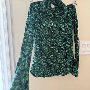The Perfect Shirt by J.Crew Liberty London long sleeve button up collared women's shirt in a size XS. Green and navy blue floral patterned long sleeve top. Preloved top no major flaws, normal wear and wash and wrinkles can be ironed or steamed out. Very gentle use. All buttons in place.