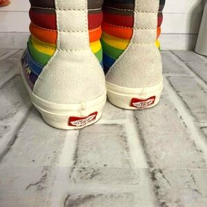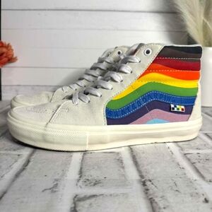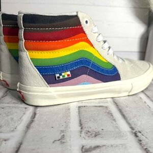 Worn only one-Stylish high-top sneakers. White exterior with pink interior. Iconic Vans design.