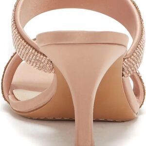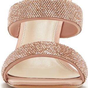 A vibrant aquamarine hue and pavé crystals enliven this square-toe sandal set on a walkable heel.