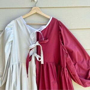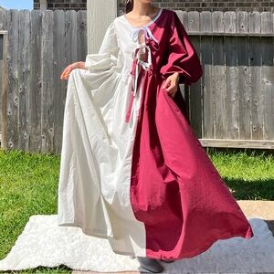This handmade cottage dress features soft puff sleeves, an adjustable tie-front, and a distinctive half-and-half color design. Made from upcycled premium cotton bedding, it combines comfort, texture, and sustainability.