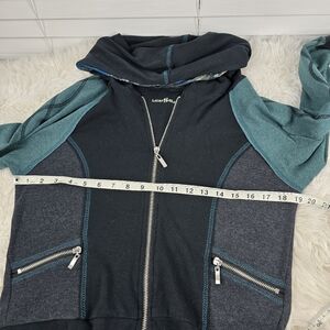 Laura Hlavac hooded sweatshirt with full zip. 2 front zippered closure pockets. Long sleeves with thumb holes. 95% cotton 5% spandex. The interior of the hood is lined with a mesh like colorful material. In good preowned condition. Light piling. Size small with measurements in the photos.