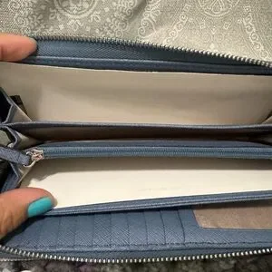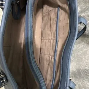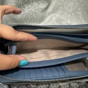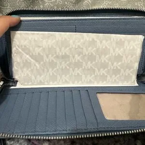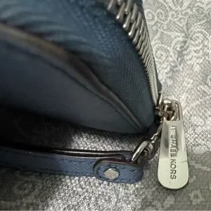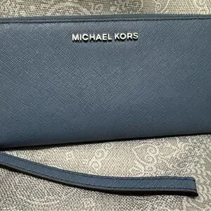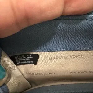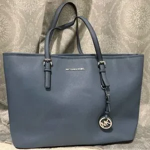 Chic Michael Kors tote with matching wallet. Stylish slate blue design. Perfect for everyday use.