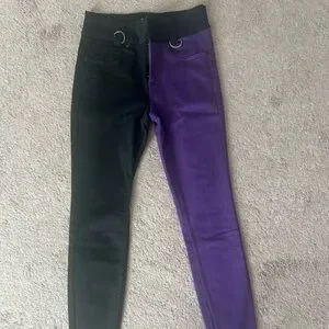 Stylish skinny jeans with a unique black and purple design. Features a high waist and durable fabric. Perfect for a bold look.