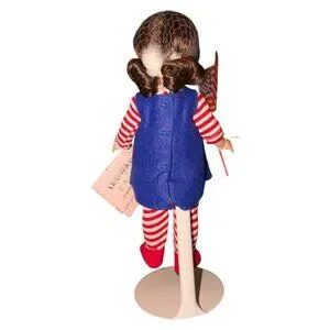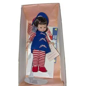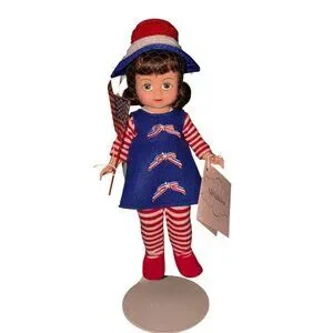 This doll's got more spirit than a cheerleader on caffeine! Decked out in patriotic style, Maggie's ready to rally the troops with her flag, and that hat is a fashion statement all its own. A collector's item that's as American as apple pie and twice as cute.