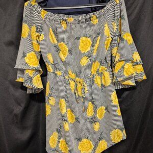 Gorgeous summer peasant blouse with cinched drawstring waist. On or off the shoulder elastic neckline. Stunning yellow roses on a black and white striped background. Ruffled sleeves and lightweight flowy material.