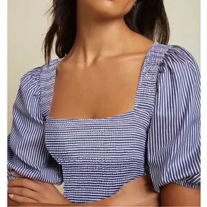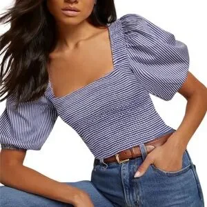 Elevate your style with this chic striped puff sleeve top. Perfect for any occasion, this blue and white top adds a touch of elegance to your wardrobe. Lightly worn.