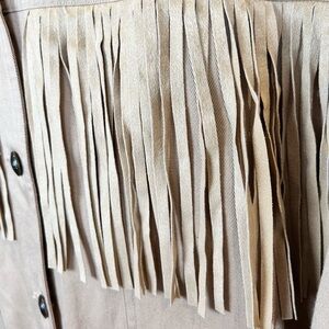 I.B. Diffusion 1993 cotton tan denim oversized jacket, size 14 with decorative studs, western-style embroidery, faux suede fringe, soft shoulder pads (removed but included with purchase) and side pockets. Some minor pinpoint stains on the sleeves near cuff, see photo. (True Color is the first full length photo)