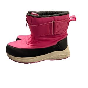 Stylish pink boots with black accents. Durable and comfortable. Easy to wear with zipper closure.
