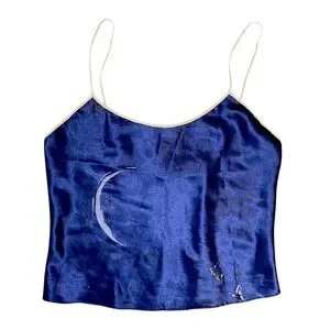 Vintage 1990s Micro Celestial Night Midnight Blue Camisole Moon Stars Silky Smooth and Slippery fabric x satin x deep navy blue with abstract faint watercolor nighttime celestial design x micro skinny straps x gold trim x 1990s Y 2K x tank top lingerie nighty babydoll cropped crop top x in good clean condition x adjustable straps x please refer to photos for reference x measuring 40” around the bust x