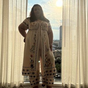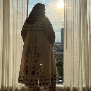 This elegant cream maxi tunic set from SHEIN is perfect for a wedding guest occasion. It features a v neck adorned with intricate floral embroidery print in vibrant reds, greens, and blues. The design adds a touch of whimsy, while the flowing silhouette ensures a comfortable and stylish fit.