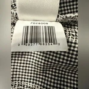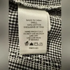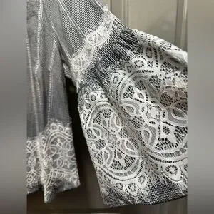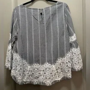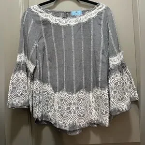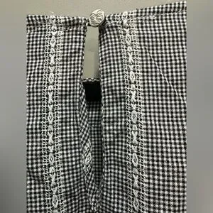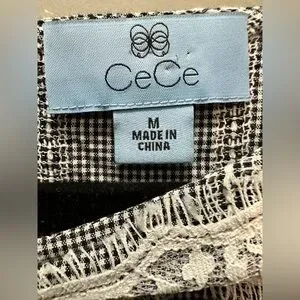 This beautiful top from CeCe is tiny black and white checks with loads of lace. The sleeves are 3/4 length. It fastens at the back neckline with a small button and elastic loop. It is 100% cotton and has not been laundered yet due to its new condition. I’m not sure if it will shrink at all. Shoulder to hem is 23 inches. Underarm to underarm is 20 inches.