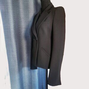 Heavy weight expensive-feeling crepe fabric, structured with shoulder pads and body darts, structured longer sleeves with pleats, and a sharp notched lapel/collar. It features a double-breasted front button closure and three front pockets.