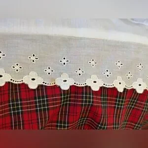 Tags: plaid, tartan, cotton, natural fibers, charming, cottagecore, eyelet lace, sailor collar, whimsical, whimsy, farmhouse, Scottish, Susanne Lively, red tartan plaid dress, heritage print maxi dress, empire waist dress, pilgrim collar, eyelet lace, vintage clothing, size 8 dress, cotton maxi dress, retro style, good vintage condition, unique vintage dress, women's fashion, nostalgia, classic design.