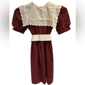 Charming kids dress featuring a classic red plaid pattern with white collar and eyelet accents with a detached grosgrain ribbon sash. Step back into the fabulous 80s with this stunning Susanne Lively red tartan plaid heritage print maxi dress. Featuring a flattering empire waist and a charming white pilgrim collar edged with delicate eyelet lace, this dress exudes vintage elegance. It’s a size 8 and crafted from comfortable cotton, making it perfect for special occasions or a retro-themed party. The dress is in good vintage condition, though it does have a faint spot on the collar and a smudge on the grosgrain wide ribbon, adding to its character. Elevate your wardrobe with this timeless piece that captures the essence of 80s fashion!