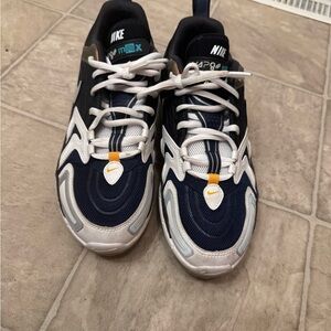 Dynamic Nike Air Vapormax Evo Navy blue and white. Features vibrant orange accents. Ideal for everyday style. This Air VaporMax EVO comes constructed in a mix of mesh and leather with a new neoprene tongue featuring a rubberized branding. 3M reflective detailing with “EVO” badges on the heels completes the design.
