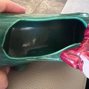 Charming green ceramic log planter featuring a whimsical red elf. Perfect for adding a touch of fantasy to your decor. Exce condition no nicks or dings