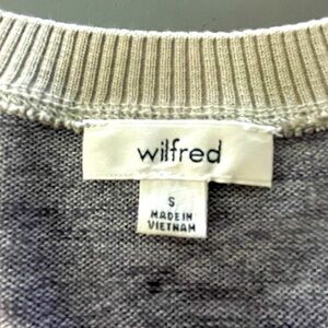 Cozy and chic, this Wilfred sweater features a stylish two-tone design in gray and tan. With a rounded neckline, long sleeves, and a trendy raw edge hem, this piece is perfect for layering or wearing on its own. Comfortable and versatile for any season.