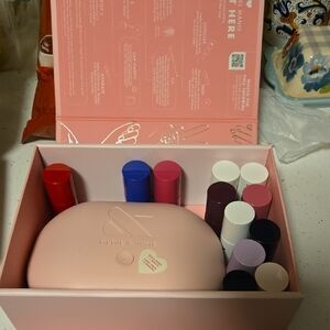 Colorful nail polish set with LED lamp. Includes red, blue, pink, purple, and white polishes. I used two of the colors once and used both the top coat and base. There is another brand new set of top coat and bases both regular and peel off base. I have all the other tools that come with the set from Olive and June but they have been used. If you would like them I will include as well. Smoke free and pet friendly home.