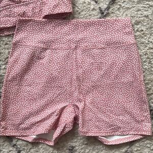 Stylish pink bra and matching shorts set with polka dot pattern.