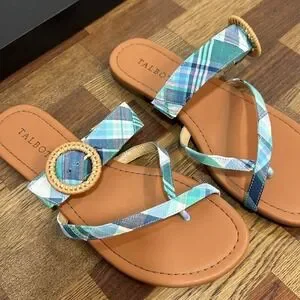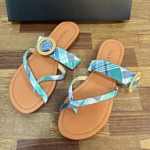 Talbots Womens Gia Buckle Sandal 8 Plaid Multi Criss Cross Summer Coastal Flat