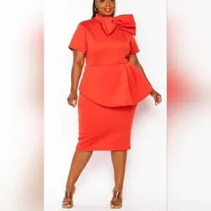 Plus Size Red Peplum Dress with Bow Detail. This elegant dress features a flattering peplum design at the waist, a body-hugging pencil skirt, and a distinctive oversized bow detail at the high neckline..comes in a vibrant red color and is designed for a plus-size fit, providing a chic and confident silhouette.