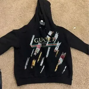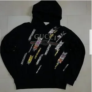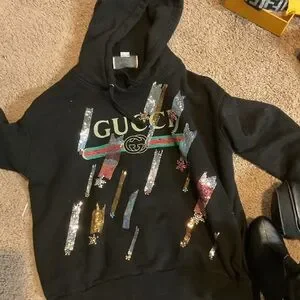 Live show listing- authentic Gucci Stylish black hoodie with colorful sequin design. Features iconic Gucci logo.