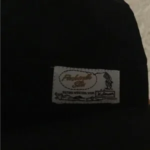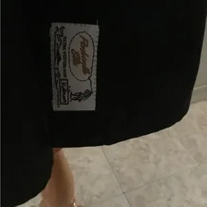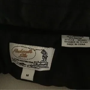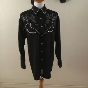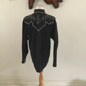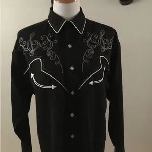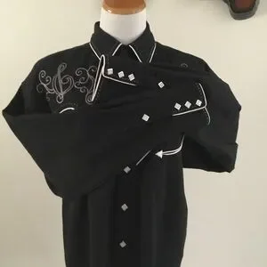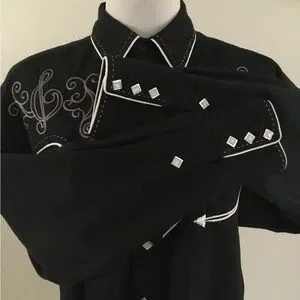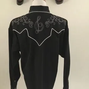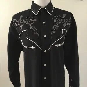 Panhandle Slim Retro Western Wear: Elegant black shirt with detailed Silver embroidery, white piping, silver and diamond shape ivory snap button shirt along with diamond shape silver ivory snaps on sleeves for closure.