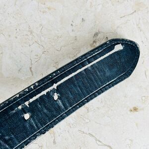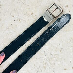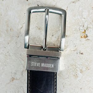 Here is a Steve Madden men's belt made of brown leather. It has a rectangle shaped brushed nickel buckle with the Steve Madden logo on it. There is a scrape on the end, it looks worse in the main photo. The second photo shows it more accurately. The 3rd photo is the back side, it does not show when the belt is worn. With its designer brand and timeless appeal, this belt is a must-have addition to any wardrobe. Preowned.