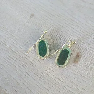 Gold toned earrings with dark green dangling stones. This is the illusion style, so it's a clear stone over the irridescent backing. Excellent condition.