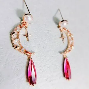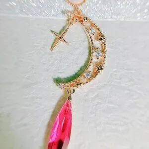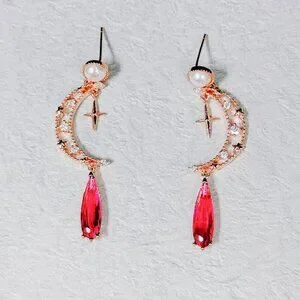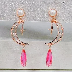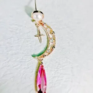 These Moon earrings feature a celestial design with a pink Crystal Pearl Teardrop as the main stone. The earrings are yellow gold plated with a screw back closure, making them easy to wear. The handmade vintage jewelry is nickel-free and has an eye-clean gemstone clarity grade. With a moon shape and dangle/drop style, these earrings are perfect for women looking to add a touch of beauty and elegance to their outfit. Made in the United States, these earrings are a unique and stylish accessory for any jewelry lover.