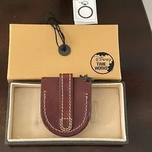 Vintage-style pocket watch featuring Mickey Mouse. Comes with a brown leather case embossed with Mickey's face.