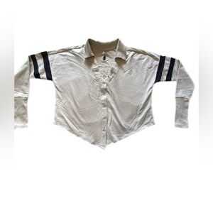 Fit: Hip-length, relaxed fit in the body with slim sleeves Features: Asymmetrical hemline, button-front detail, collared neckline, thumbholes at both sleeves