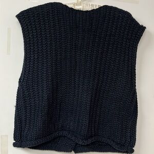 Stylish navy blue knit vest featuring gold buttons. Perfect for layering.